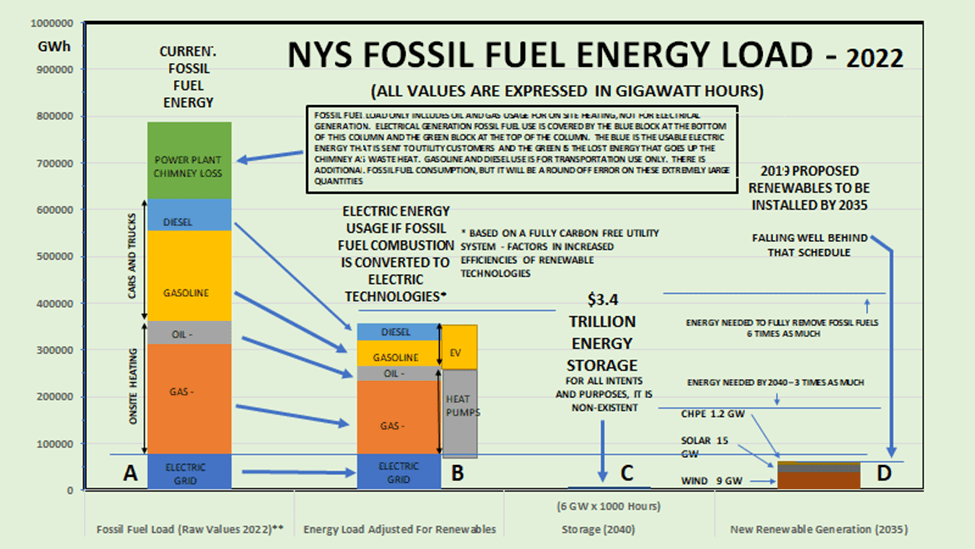 “A” is the Existing Fossil Fuel Consumption in NY State. “B” is the Electric Load if all of that was converted to electric technologies on a fully GHG free generation system. “C” is 6 GW of 1000 hour storage as mentioned in the NY State Energy Storage report. Current cost using Lithium-Ion batteries, $3.4 Trillion. NY State is betting on technologies that don’t exist commercially yet and at present, have shorter lifespans than the 10 years of Lithium-Ion. “D” was the projected renewable installation for 2035 estimated in 2019 using figures provided by NY State. With solar projects being canceled, in 2023 that is an overly optimistic estimate.