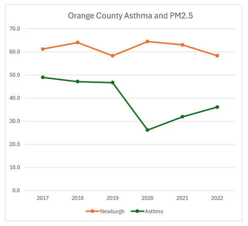 The CORREL correlation coefficient for the Newburgh monitor and the Total asthma emergency department visit rate per 10,000 in Orange County was -0.45. Inhalable particulate (PM2.5) concentrations are multiplied by 10.