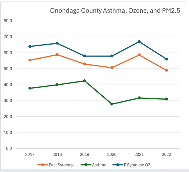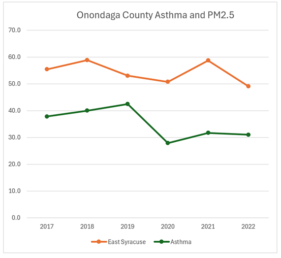 The CORREL correlation coefficient for the East Syracuse monitor and the Total asthma emergency department visit rate per 10,000 in Onondaga County was -0.45. Inhalable particulate (PM2.5) concentrations are multiplied by 10.