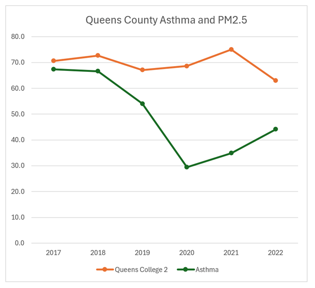 The CORREL correlation coefficient for the Queens College 2 monitor and the Total asthma emergency department visit rate per 10,000 in Queens County was -0.37. Inhalable particulate (PM2.5) concentrations are multiplied by 10.