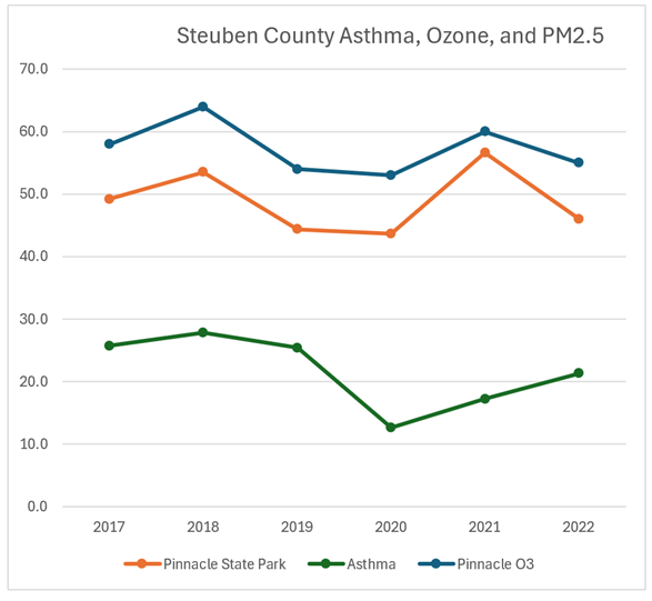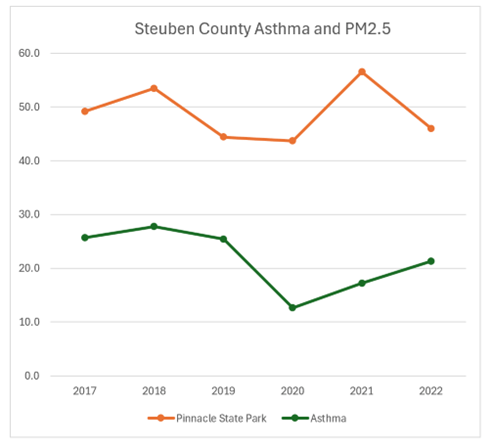 The CORREL correlation coefficient for the Pinnacle State Park monitor and the Total asthma emergency department visit rate per 10,000 in Steuben County was -0.08. Inhalable particulate (PM2.5) concentrations are multiplied by 10.