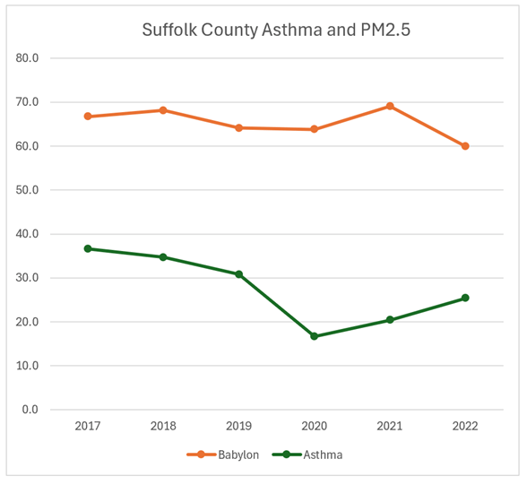 The CORREL correlation coefficient for the Babylon monitor and the Total asthma emergency department visit rate per 10,000 in Suffolk County was -0.50. Inhalable particulate (PM2.5) concentrations are multiplied by 10.