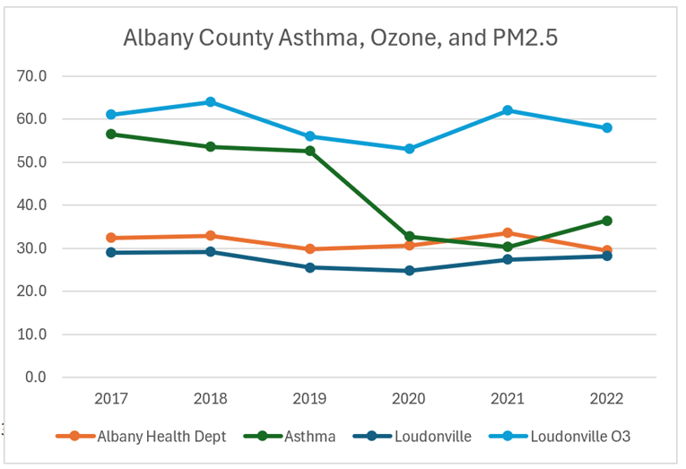 The CORREL correlation coefficient for the Albany monitor and the Total asthma emergency department visit rate per 10,000 in Albany County was 0.07 and for Loudonville it was 0.40. Note that these were the only correlation coefficients that suggested there was a positive relationship between pollution and asthma. Inhalable particulate (PM2.5) concentrations are multiplied by 5 in the graph.