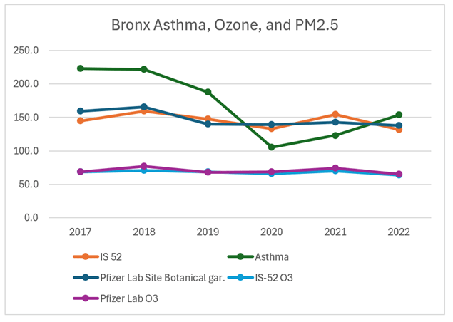 The CORREL correlation coefficient for the IS-52 monitor and the Total asthma emergency department visit rate per 10,000 in the Bronx was -0.46 and -0.80 for Pfizer Lab Site Botanical Garden. Inhalable particulate (PM2.5) concentrations are multiplied by 20.