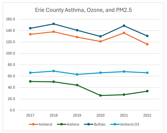 The CORREL correlation coefficient for the Amherst monitor and the Total asthma emergency department visit rate per 10,000 in Erie County was -0.62 and -0.51 for Pfizer Lab Site Botanical gar. Inhalable particulate (PM2.5) concentrations are multiplied by 10.
