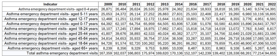 I compared the emergency room visits due to asthma health effect relative to observed data from the .New York State Asthma Dashboard. Table 1 lists the annual asthma emergency room visits for different age groups. All my analyses used the total asthma emergency department visits. Of particular interest note that the Covid Pandemic changed the identification of asthma. In my opinion, limiting the comparison data from 2009 to 2019 would be more representative of an actual relationship.