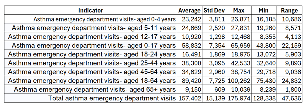 Emergency room asthma reporting changed in 2020 due to Covid. Because this changed the reporting metric, I ran the statistics for the data available from 2009 to 2019. Table 2 lists simple statistics describing the data for that period. The range of emergency room visits over all 10 years of data before Covid is 47,636. The maximum number of avoided emergency room visits is 24% of the standard deviation and 7.6% of the range of observed emergency room visits. The predicted improvement is a small fraction of the observed emergency room visit variation.