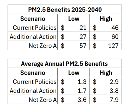 This figure depicts the year 2040 outcome of benefits vs. costs for the four scenarios, Current Policies; Additional Action; Net Zero Scenario A; Net Zero Scenario B.