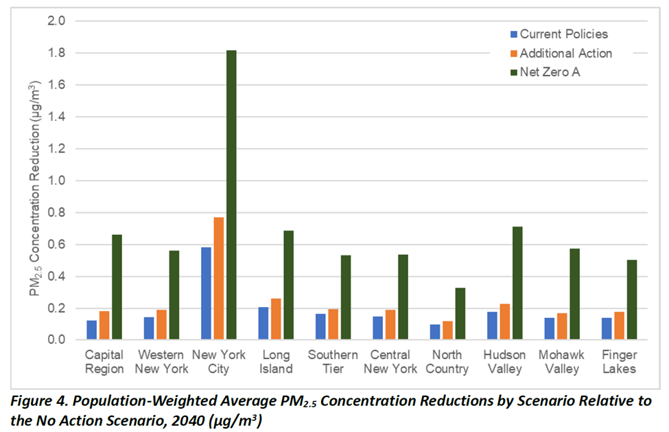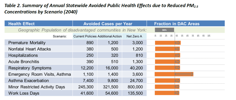For the projected Health Benefits, largely relying on PM2.5 reductions, I simply note that the regional trends are such that there will be no conceivable way to confirm a cause-and-effect relationship for whatever health outcomes emerge in the State. There could be improvement unrelated to NY energy systems evolution, or there could be degradation for reasons unrelated to energy systems even if one of the scenarios occurs physically as projected. No one will know. This problem of confounding factors is apparent from the graphs at this EPA website, as air quality data varies within a generally improving trend since 2010.