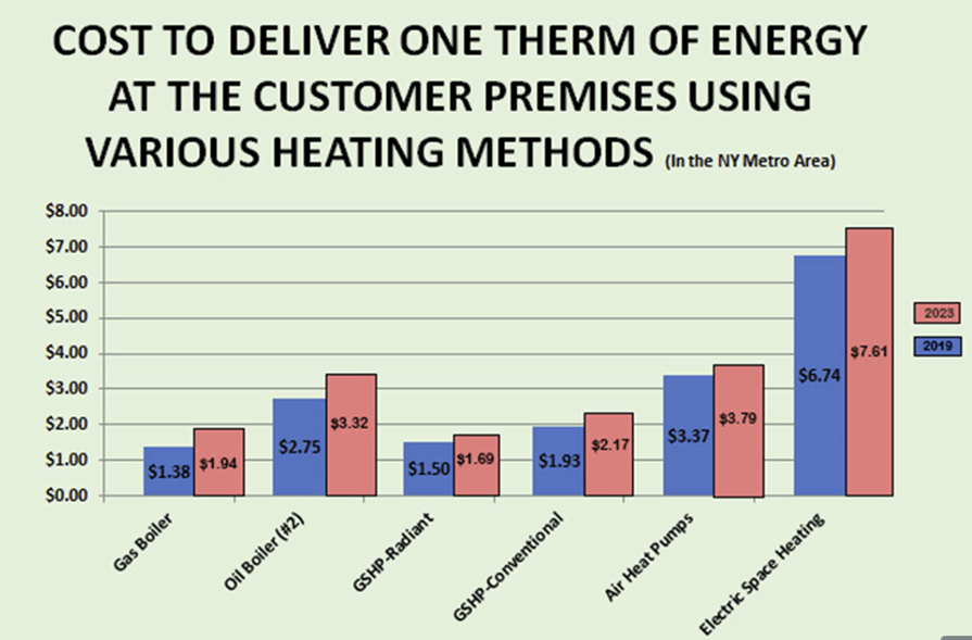 To provide a pictorial view of the issues, below is a graph that I generated for a discussion with NYSERDA (NY State Energy Research and Development Authority) in 2019 that shows the relative costs of various types of heating solutions in the downstate region. NYSERDA confirmed that the numbers matched their analysis. I updated it in 2023 for another presentation. Gas heat was at $1.94 per therm (100,000 BTU) including efficiency losses. An air source heat pump costs $3.79 per therm because of the high cost of downstate electricity relative to gas. One of the reasons that our electricity costs so much is that 90% of the fossil fuel plants in the downstate region are from the 1960’s and 1970’s and are very inefficient. As a result, even if a heat pump has a 300% efficiency but it gets its electricity from a power plant that is 30% efficient, that is only 90% efficient in the best-case scenario. In cold weather, the heat pump efficiencies can drop below 200% and even as low as 100%, so the system wide efficiency can drop to 66% efficient or 33% efficient while a new gas furnace can operate with efficiencies of 90% – 95%. That is why I said that heat pumps can reduce holistic efficiency. Local Law 97 using false metrics to support the plan is dangerous and will likely end up with NY City subject to a class action lawsuit for all the penalty revenue that they collect under the Law.