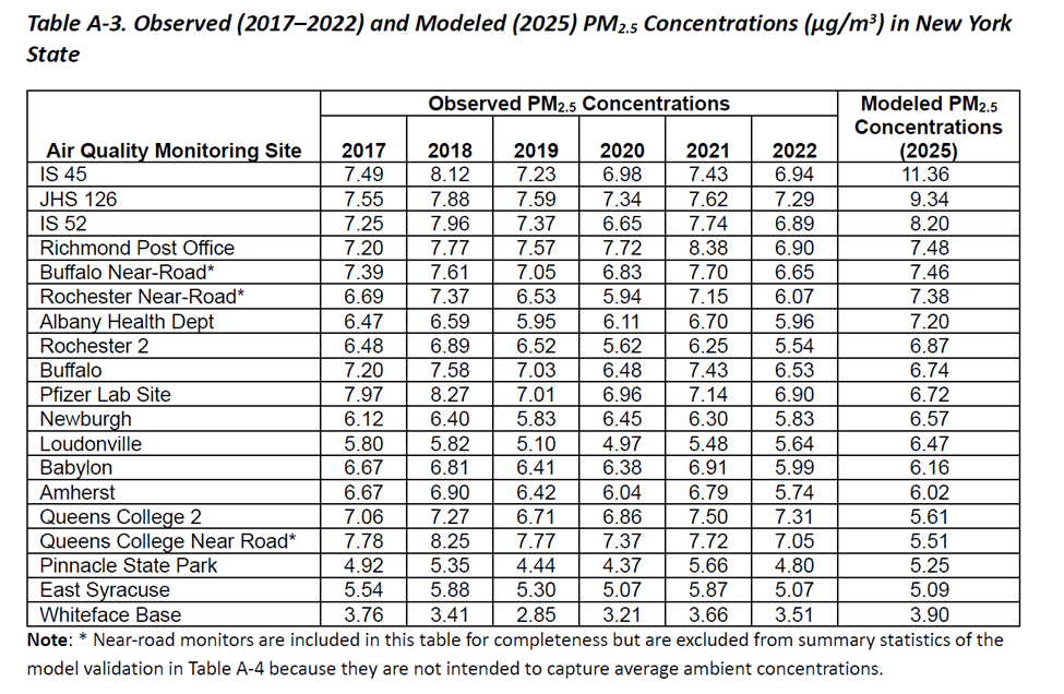 The New York State Department of Environmental Conservation (DEC) operates an ambient air quality monitoring system across the state and prepares annual reports. The methodology appendix in the Health Benefits chapter of the Draft Energy Plan compares the observed inhalable particulate matter (PM2.5) with their model predictions to validate their approach as shown in Table A-3 below. That analysis used data from 19 monitoring sites. This analysis will use the same sites except for the near-road monitor because they are not intended to capture average ambient concentrations.