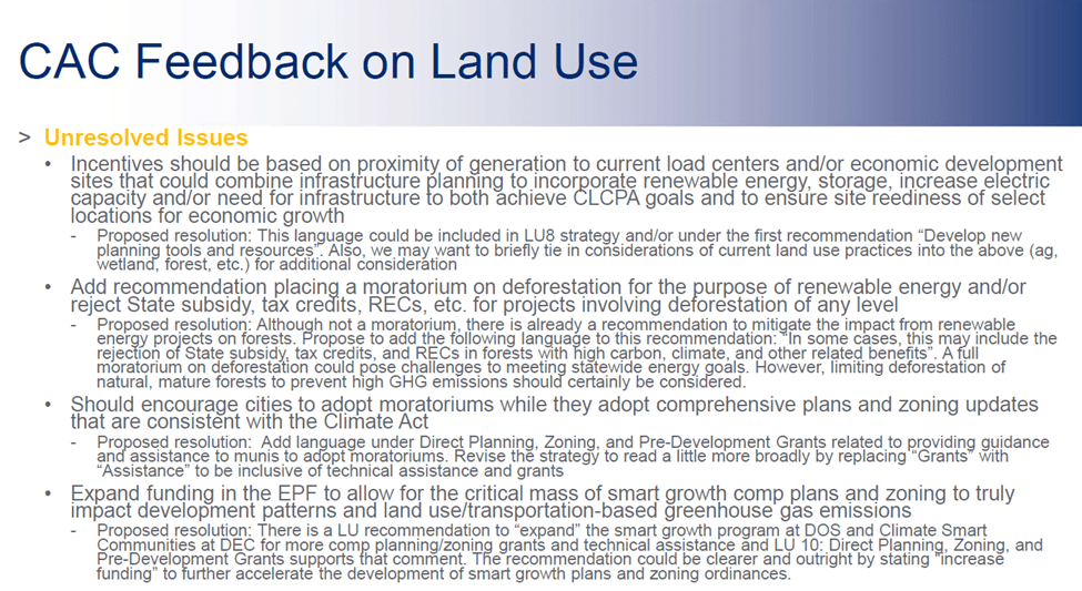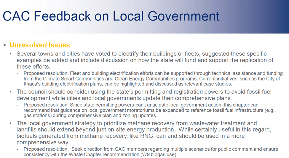 At 1:13:38 of the video recording, general feedback contentious unresolved issues were discussed. The first issue raised was that the Climate Justice Working Group (CJWG) input on implementation strategy recommendations (including rejection of certain recommendations and the need for more robust plans/efforts in transportation and waste) were not integrated well enough in the draft. Staff authors did not think it was appropriate for them to take items out of consideration so they asked the Council to decide about the recommendations. Eventually I will have to address the CJWG input process in more detail but that will be a long post. In brief, my concerns about virtue signaling ideologues with no relevant energy sector expertise making policy are much greater for this group than any other Climate Act group or panel. They simply do not accept that concerns for energy reliability and affordability have to be balanced against their expectations. There are Council members that agree with that premise and I believe they made these comments. However, the recommendations to reject any policies and go even further for other policies are inappropriate simply because there are constraints and concerns that deserve to be addressed with public input beyond the Climate Act echo chamber. It will be interesting to see if the Council votes to accept these recommendations.