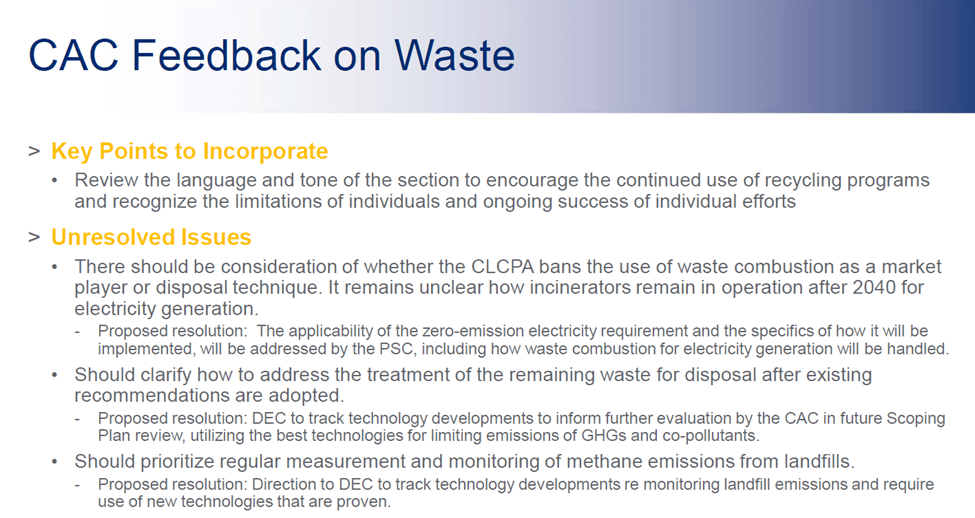 There was one unresolved controversial waste chapter issues (2:05:38 of the video recording). The controversial issue was whether the Climate Act bans the use of waste combustion as a market player or disposal technique. The controversy is whether the 2040 zero-emission electricity requirement bars the use of incineration as a waste management option if the incinerator also produces electricity. The Staff response stated that the applicability of the zero-emission electricity requirement and the specifics of how it will be implemented, will be addressed by the PSC, including how waste combustion for electricity generation will be handled. In my opinion it is wishful thinking to believe that the waste stream will be reduced so much that incineration won’t be necessary. If there is a need to incinerate then not using the electricity seems counter-productive.