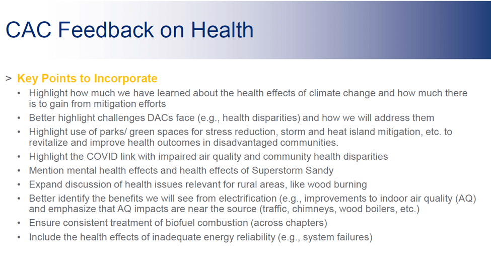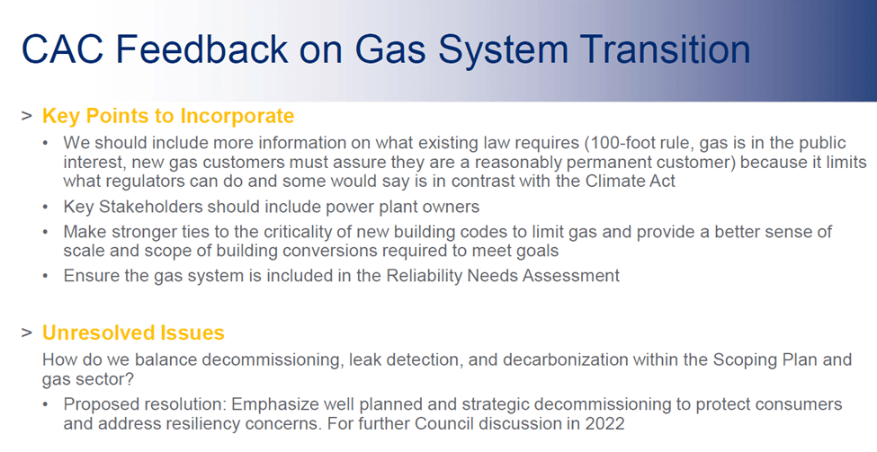 Note that the slide makes the point that the vote will pass based on a simple majority. They emphasize the point that the vote is “Not an endorsement of any or all strategies and actions contained in the Draft”. I am troubled by the last point that “Throughout 2022, CAC will discuss and deliberate, and consider public comments, towards a Final Scoping Plan” because that could mean that they will be changing the scoping plan outside the purview of the public participation process. This post discusses the unresolved issues in the scoping plan draft that I thought were controversial.
