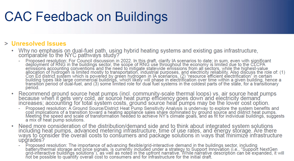 Three unresolved issues were discussed (1:30:24 of the video recording) in the buildings chapter. The first asked why there was no discussion of a dual-fuel path, using hybrid heating systems and existing gas infrastructure, comparable to the NYC pathways study. This is similar to the dual-fuel electricity issue discussed above. Staff stated that there isn’t time to do this now and suggested that the Council discuss this next year. One of the issues with this problem is that the anti-natural gas authors of the Climate Act deliberately gamed the emissions accounting conventions to prevent the use of methane from any source. Because all emissions have to be reduced, the result is that they need hydrogen for uses where combustion is necessary such as “transportation, industrial purposes, and electricity reliability”. In my opinion the special interest authors snuck this requirement in either deliberating ignoring the impacts or unaware of the challenges introduced with them. The dupes who voted for the Climate Act had no idea of the consequences so now we are stuck with them. The Climate Act’s failure to develop a rational, feasible plan is a recipe for reliability crises.