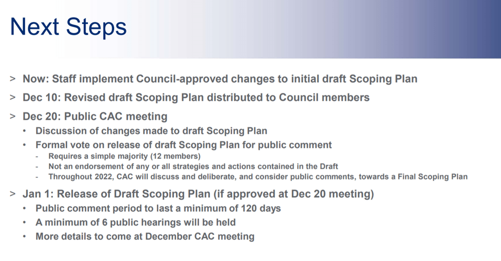 The November 30, 2021 meeting presentation included the following slide describing the next steps. Staff has implemented Council-approved changes to initial draft Scoping Plan but there still are unresolved issues. In fact, they had to schedule another meeting to reconcile remaining issues so that the revised draft Scoping Plan can be distributed to Council members by December 10. There is another meeting scheduled for December 20 when there will be a formal vote on the release of draft Scoping Plan for public comment. The plan is to release the Draft Scoping Plan on January 1 if it is approved at the last December meeting.